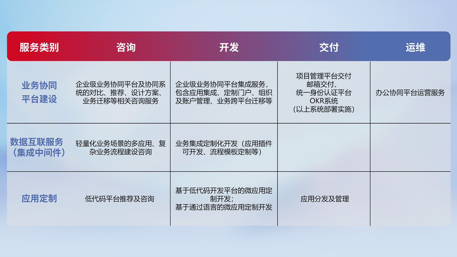 针对钉钉、、、、企微、、、IDaas等平台级产品提供产品的规划、、方案、、、、交付、、定制化开发等服务,,,实现如统一协同办公、、智能客户服务、、、混合会议管理、、、、智能数据查询、、、、等业务场景,,,,实现数字化转型。。。