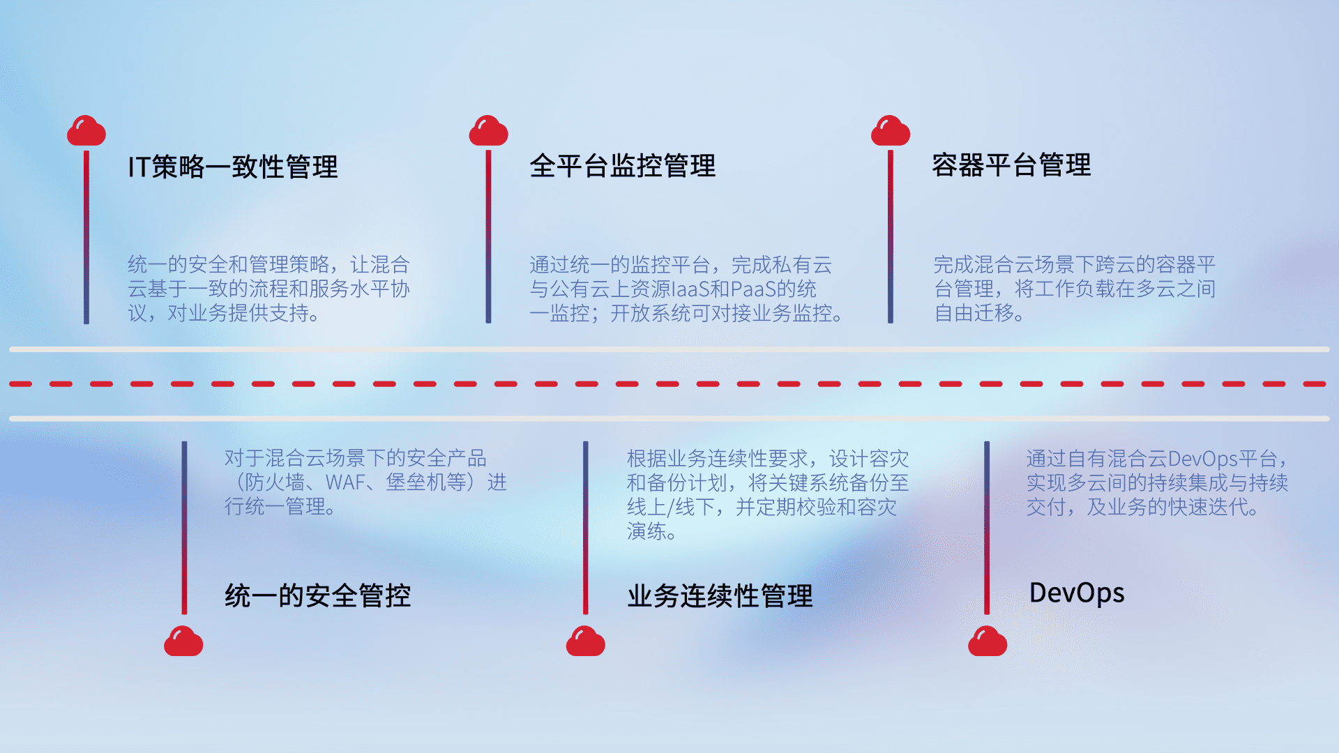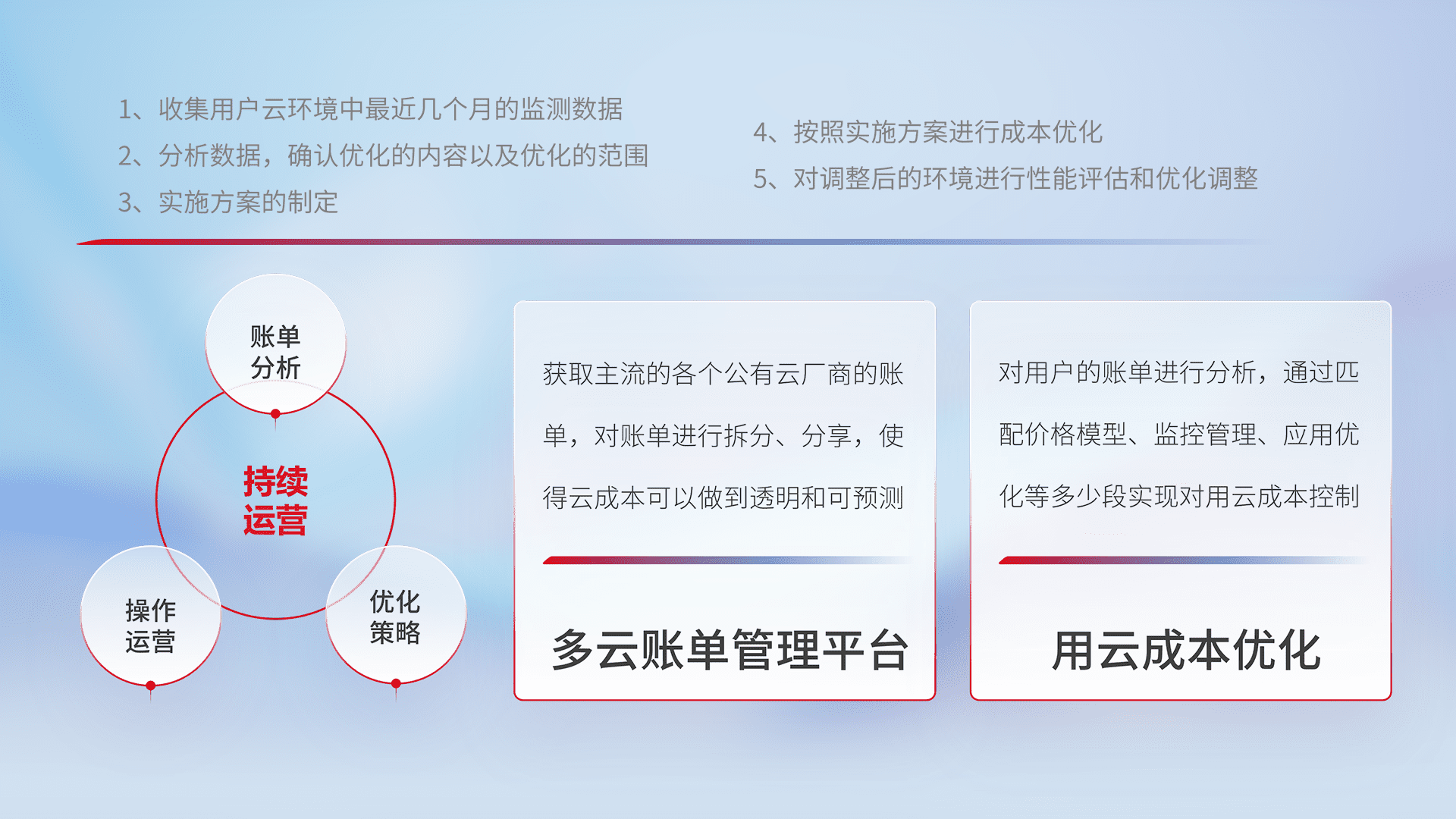 通过多云纳管,,以统一的资源数据模型把客户的云资源进行抽象和封装,,进而实现对多云资源的统一操作,,保障云资源管理的可靠性、、、稳定性与可用性。。。。量身定制化运维内容,,配置、、、开发运维、、、、补丁管理、、备份、、、监控、、、认证和访问管理、、、、审计和日常巡检等,,,,保障在用云过程中的可靠度,,,,稳定度以及高可用率。。