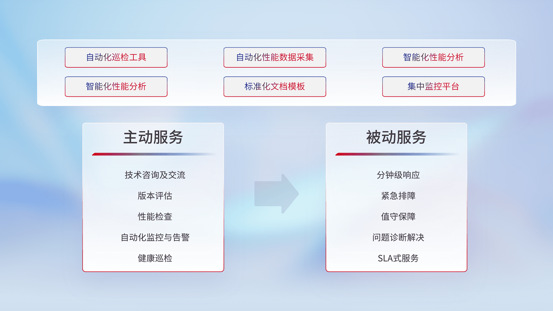 智能化工具和标准化文档,,保障服务质量,,,,提供主动服务(包含技术咨询、、、、版本评估、、性能检查、、、自动化监控与告警、、、健康巡检)和被动服务包含(分钟级响应、、紧急排障、、、、值守保障、、、、问题诊断解决、、SLA服务)。。。。